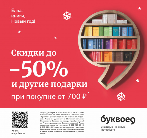 Буквоед тоже приготовил кое-что замечательное: с 1 по 31 декабря во всех магазинах сети при покупке от 700 рублей можно принять участие в игре и вытянуть на кассе скретч-карту, в которой спрятан замечательный подарок. Скидки до 50%, сувениры, новогодняя ёлка или целая полка с книгами — какой сюрприз ждёт вас? Ответ на этот вопрос вы узнаете в Знаковом книжном.