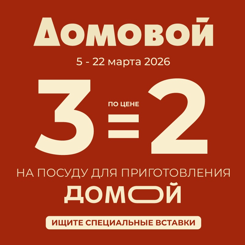 * Акция действует с 05.03.2026г. по 22.03.2026 г. в розничных магазинах «Домовой» на посуду для приготовления ТМ «ДОМОЙ», выделенную специальными вставками «3 по цене 2».